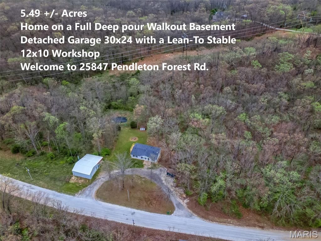 Ranch home with a Split Bedroom Floor Plan with a Deep Pour Walkout Lower Level on 5.49 +/- Acres. Let your mini-farm life start right here! Check out the mature deer photos too! Gorgeous acreage and a nice home with a walkout lower level. There's a detached 30x24 Garage Outbuilding with an attached lean-to area for a stable or shelter area. There is also a detached 12x10 workshop and a metal utility shed. Step inside to a large vaulted great room area with open floor plan from the great room to the kitchen and breakfast bar to the dining room. There is also a space for an office area off the side of the huge great room. Main floor laundry room comes complete with a washer and dryer. The kitchen has black and stainless steel appliances, including the refrigerator, and the dishwasher is new! Primary bedroom with En Suite has a soaking tub and separate shower and beautiful oversize vanity, mirror and updated lighting. Bedroom two is next to the hallway bathroom. Walkout deep pour lower level is awaiting your finishing touches for you to customize and there is a rough-in for a third full bathroom. There is also a wood burning stove in the basement. There is a nice deck off of the main floor to view the peaceful acreage and BBQ. Unincorporated area so no city taxes! Warrenton R-III Schools. Easy access to Highway 70. You've found your new home or maybe even your new weekend getaway place if you are looking for a quiet, peaceful retreat. Refrigerator, Washer, Dryer, TV over breakfast bar, Sofa and barstools can be included if desired. (New Roof in 2024 - New deck in 2026 - and a newer water heater too.)